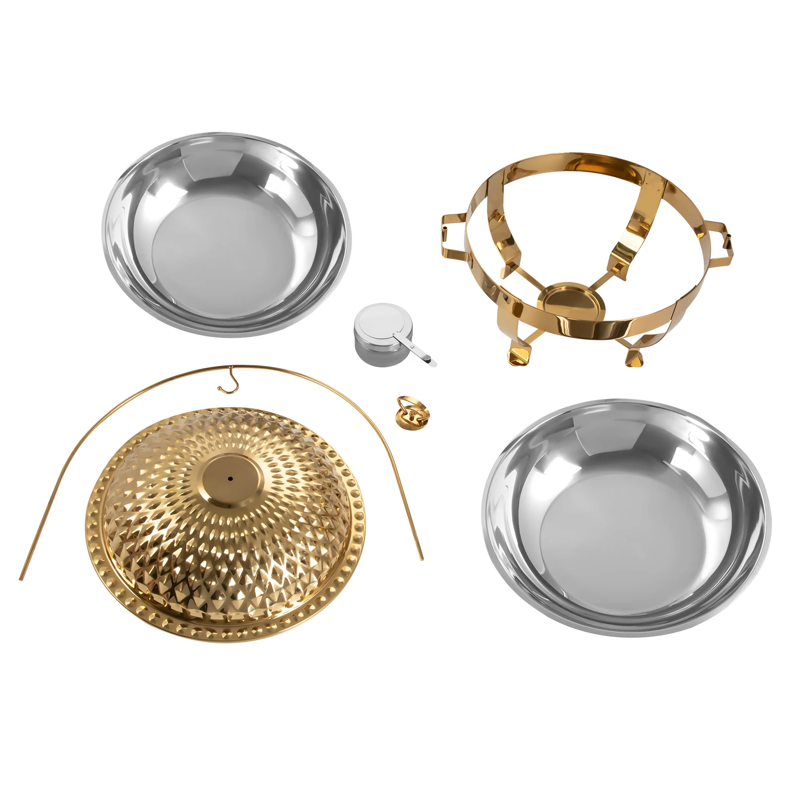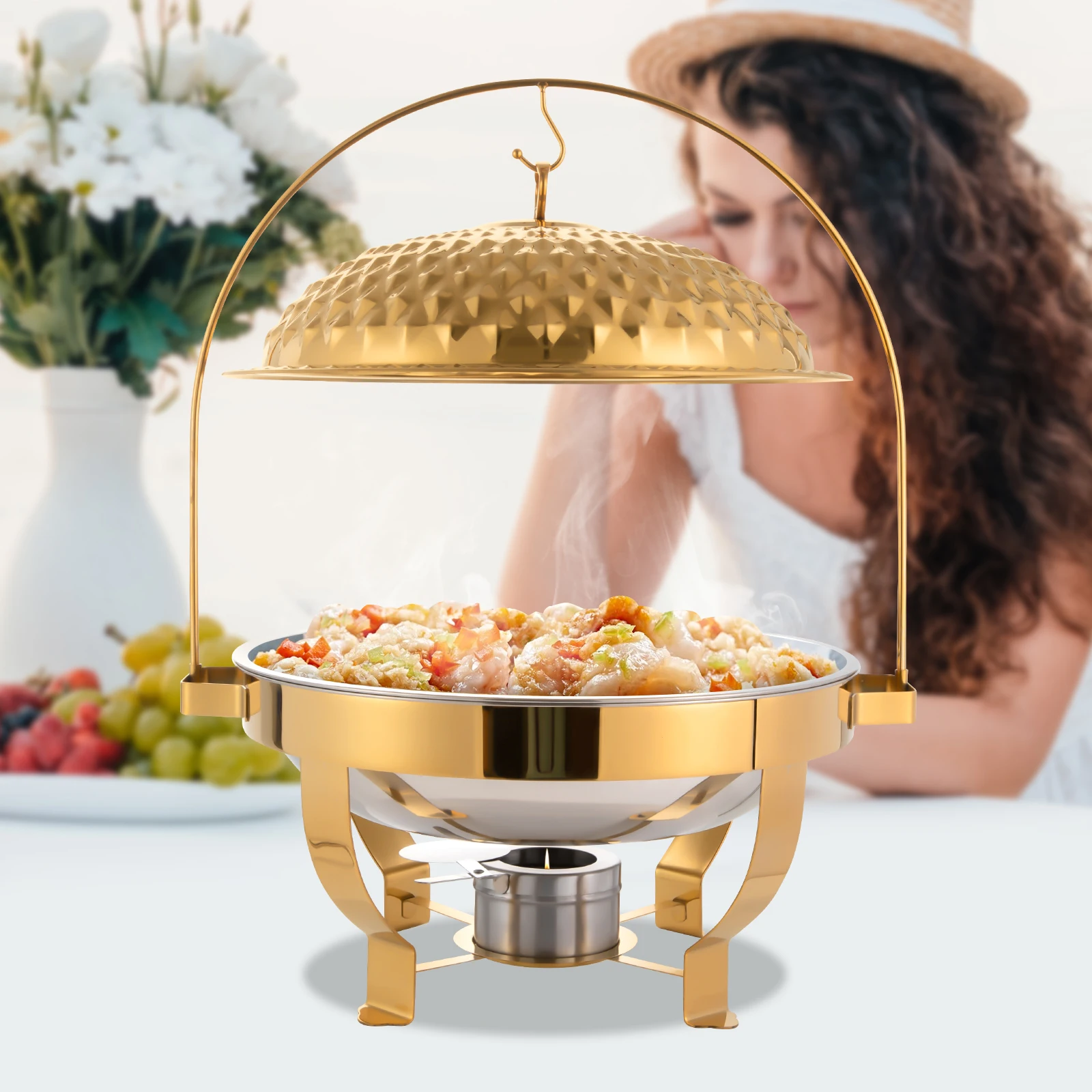 8L Commercial Round Hanging Lid Dining Stove Party Chafing Dish – Elegant Stainless Steel Buffet Set with Gold Accents for Catering, Events, and Parties