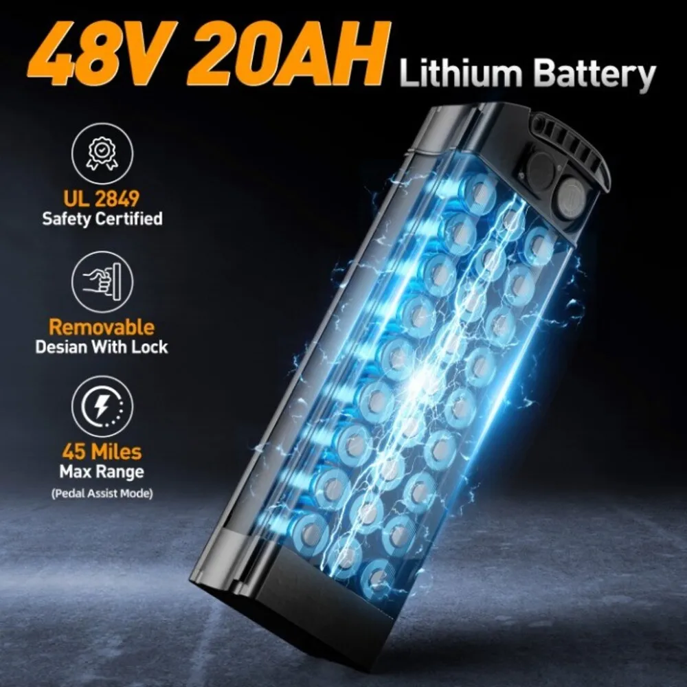 With 14″ tires, this bike provides a stable and smooth ride, while the 48V battery (available in 20AH, 15AH, or 10AH configurations) ensures you have ample range for longer trips, offering up to 50-70 miles on a single charge. The choice of battery capacity lets you select the perfect balance between range and weight, making it easy to tailor the bike to your needs.