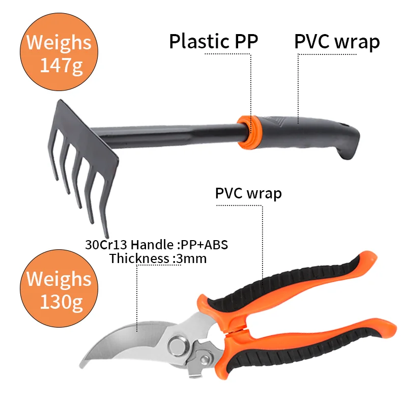 Made with PVC-coated rubber handles, these tools offer a comfortable, non-slip grip for all-day use, while the PP + ABS handle material ensures long-lasting durability that can withstand harsh outdoor conditions. Whether you’re planting new flowers, maintaining shrubs, or weeding your garden, this set provides all the necessary tools for a successful gardening experience.