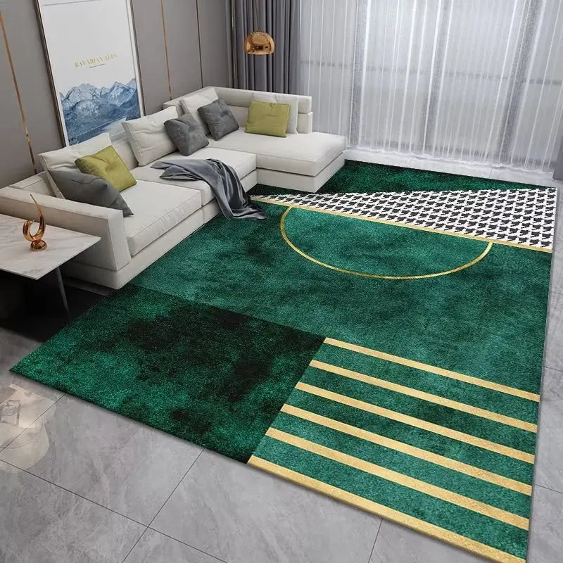 Luxury Modern Geometric Living Room Carpet – Golden Green Washable Fluffy Area Rug for Bedroom & Home Decoration