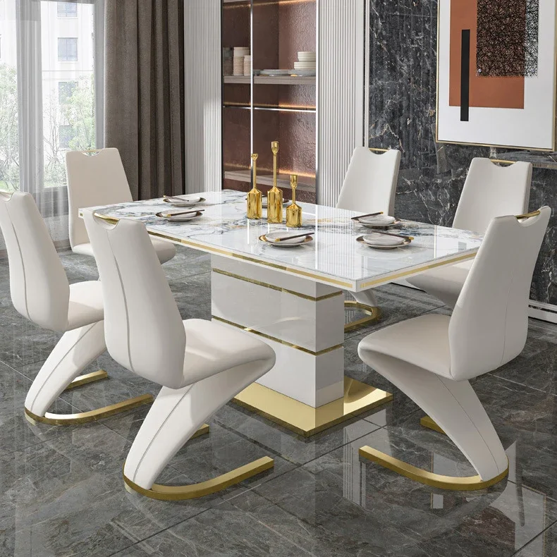The gold stainless steel legs offer an eye-catching touch of luxury and are built for long-lasting durability, ensuring this dining table set is both an aesthetic centerpiece and a functional investment. Complemented by matching upholstered chairs, the set provides an atmosphere of modern sophistication, ideal for both intimate dinners and larger gatherings.