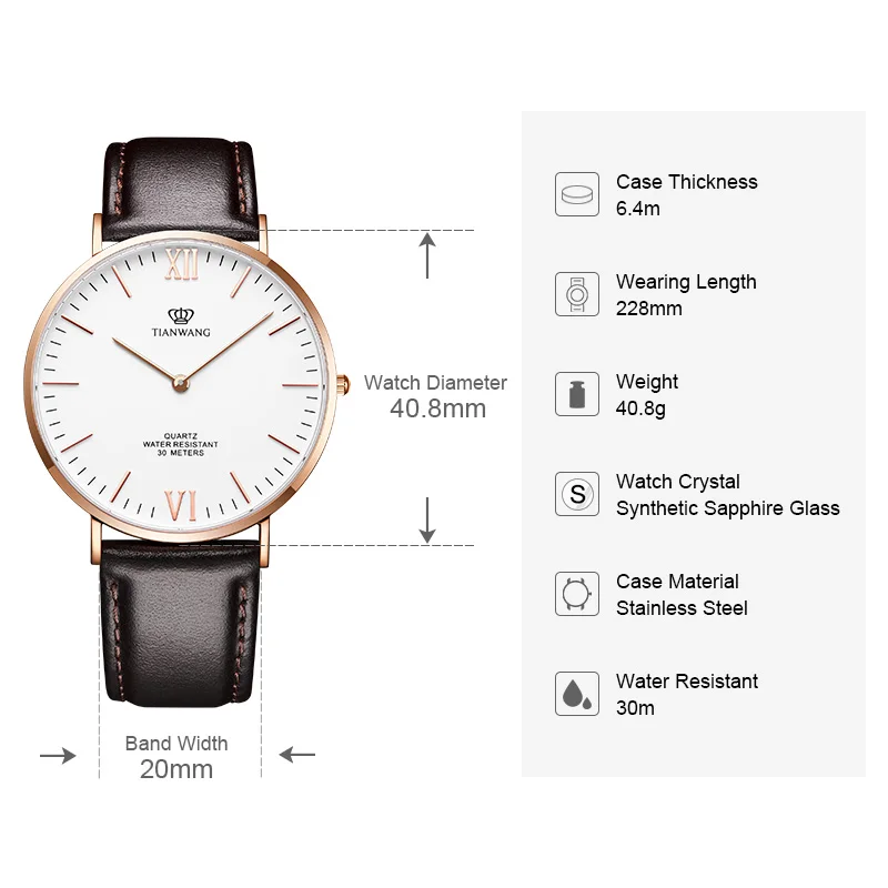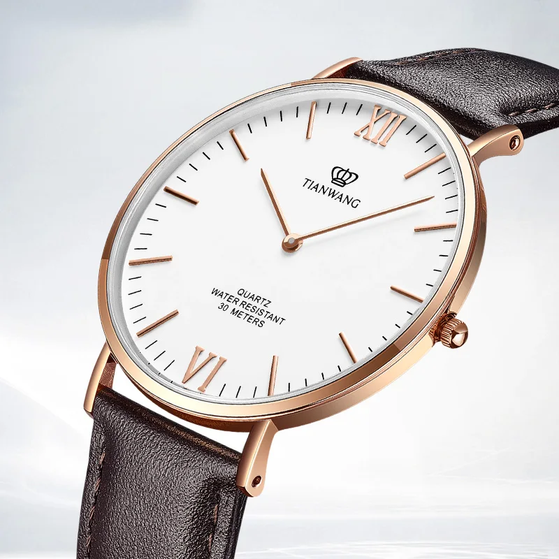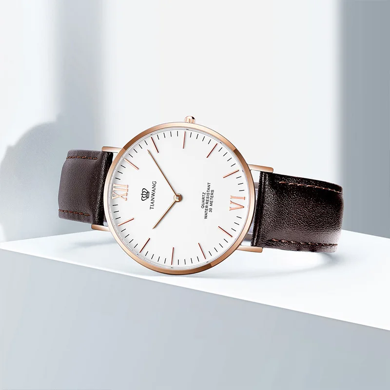 The TIAN WANG Business Leather Quartz Watch for men is the perfect blend of elegance and precision. Featuring a 40.8mm dial with a clean, simple design, this timepiece is ideal for professional settings and formal occasions. The watch is powered by a reliable quartz movement, ensuring accurate timekeeping. Its sapphire crystal adds an extra layer of durability, being scratch-resistant and offering clear visibility. The sophisticated leather strap provides a comfortable fit while enhancing the overall stylish appeal. Whether you’re dressing for business or a special event, the TIAN WANG watch makes a timeless statement of luxury and class.