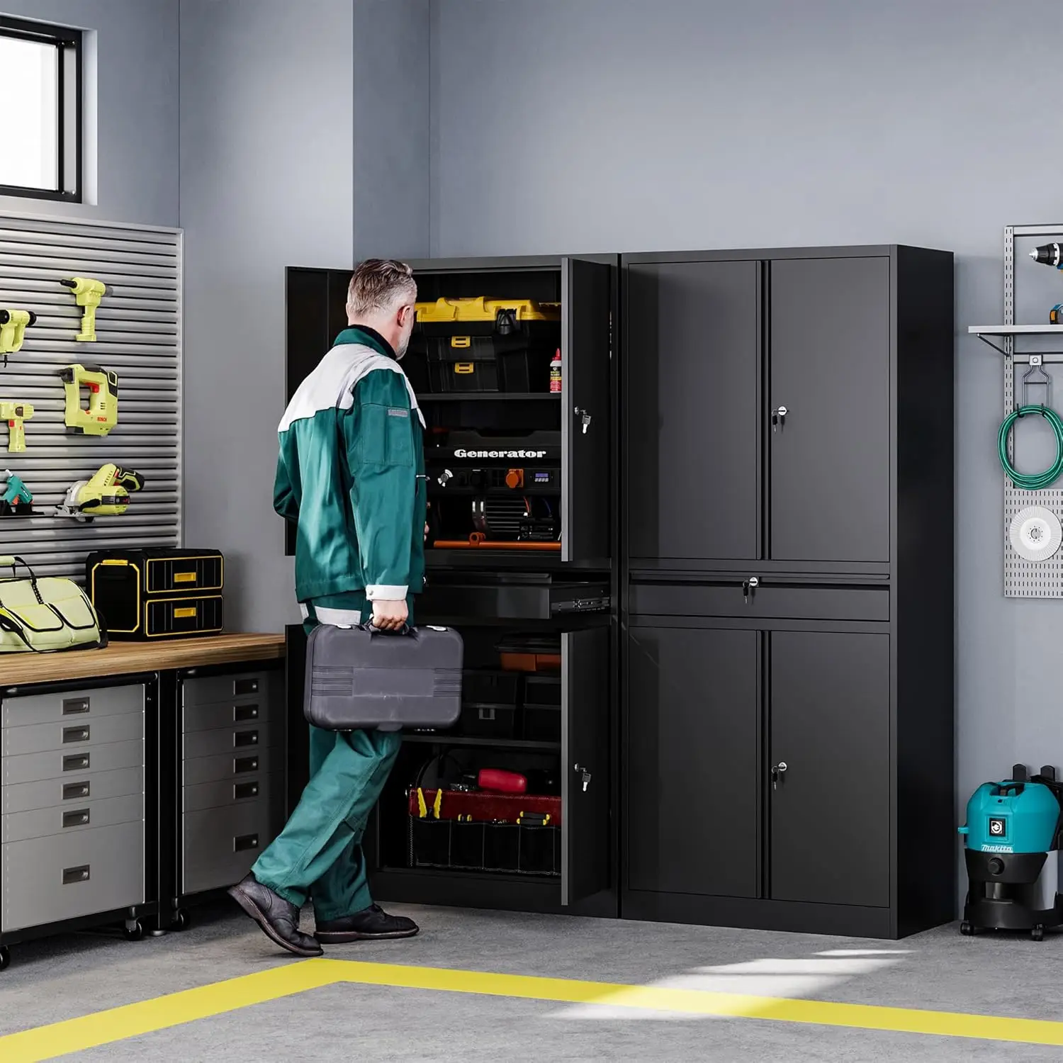 Perfect for home workshops, offices, or garages, the Metal Garage Storage Cabinet offers an excellent way to maintain a tidy and secure environment. With its sleek design and functional storage space, it’s a must-have addition to any utility room, office, or garage setup.