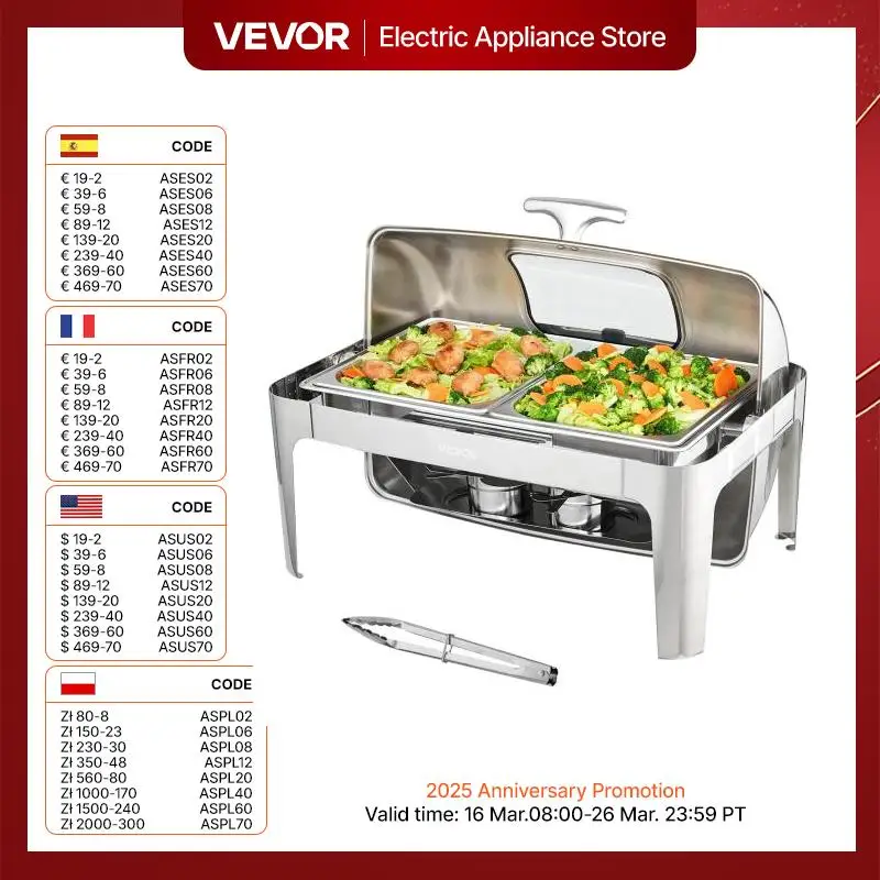 Add a professional touch to your next event with the VEVOR 9QT Roll-Top Chafing Dish Buffet Set. Designed to keep your food warm, fresh, and beautifully presented, this stainless steel chafer is a must-have for any catering service or buffet setup.
